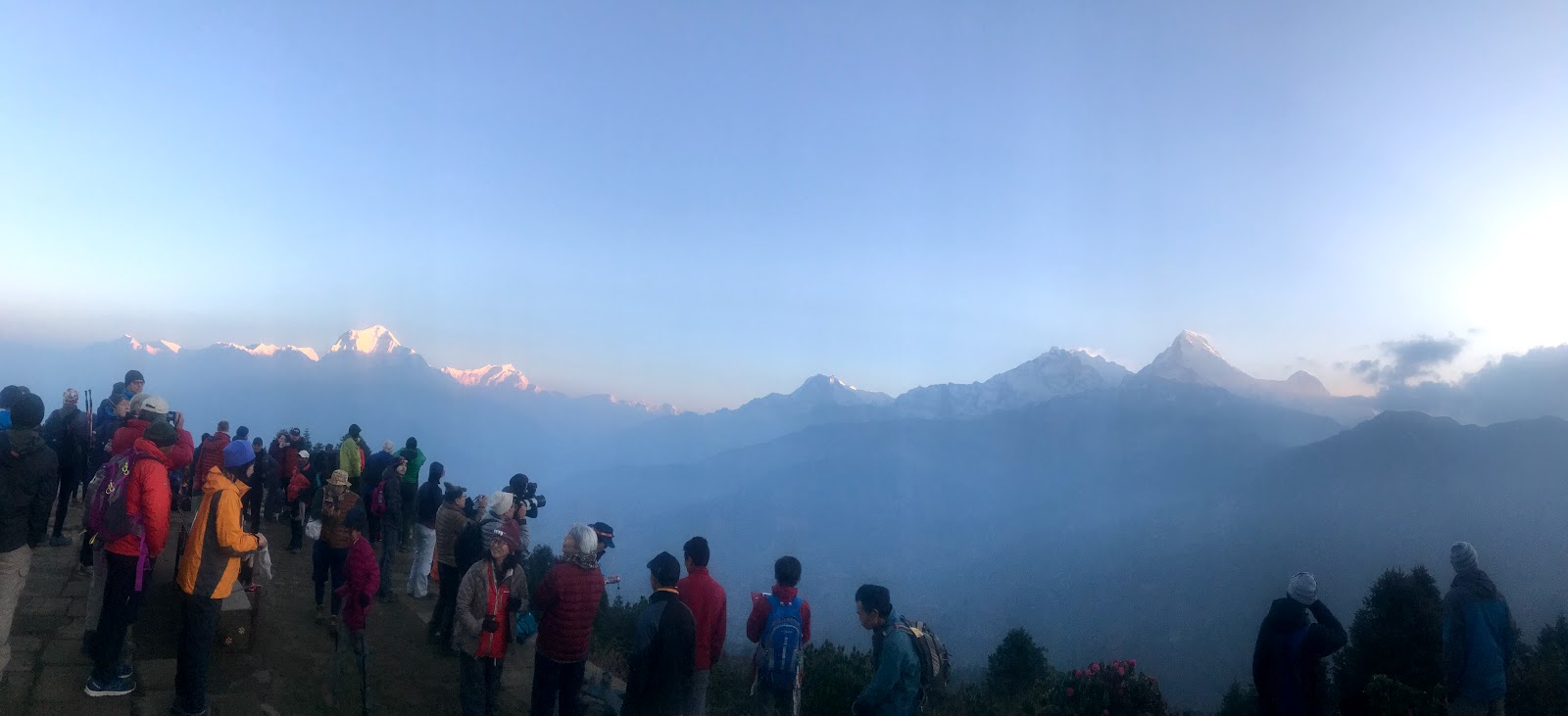 トレッキング三日目、よほど日ごろの行いがよかったらしく、朝5時、ゴレパニから登ること約40分のプーンヒルから夜明けを迎えるアンナプルナ山群やウラギルリなどの山々が神々しく刻々と変化しながらくっきりと見える。(山岡満)